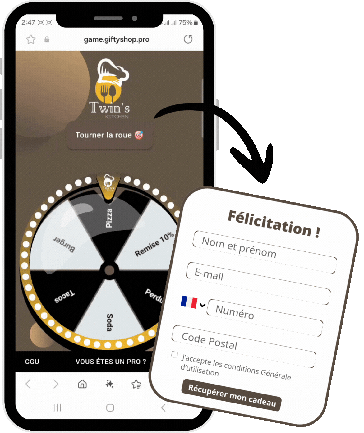 C’est très simple : vos clients scannent un QR code disponible dans votre établissement ou sur vos supports de communication, et ils peuvent tourner la roue pour tenter de gagner les cadeaux ou avantages que vous proposez.